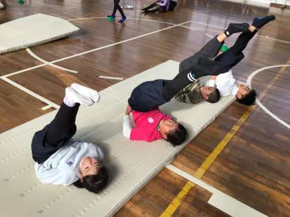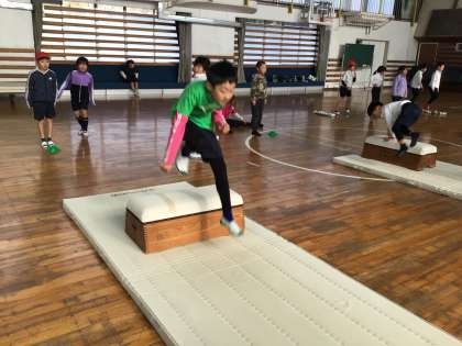 12/5 2年 体育 マット 公開日 2025/12/05 更新日 2025/12/05 第2学年の様子 最近の体育ではマット運動をしています。今日は跳び箱などを使って楽しみながらいろいろな動きをしました。 2年