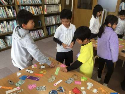 4月からの貸出冊数が多い児童に、図書ボランティアさん手作りのしおりがプレゼントされました。1年生はたくさんの子がしおりを貰いました。たくさんの種類のしおりがあって、どれにしようか迷ってしまいます。選ぶのも楽しいです。図書ボランティアさんありがとうございました。