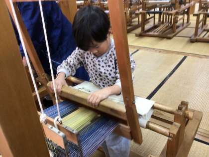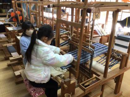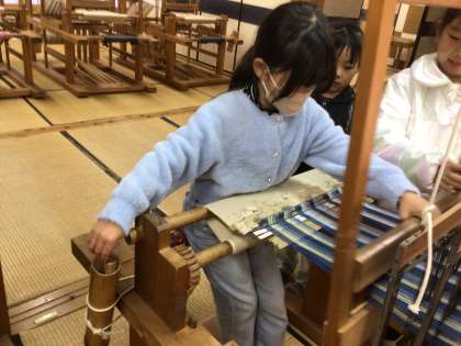 午前中は、足助屋敷でグループに分かれて体験活動を行いました。機織りです。コースターを作りました。
