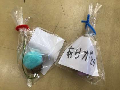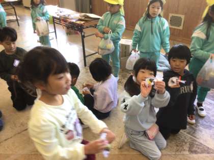 最後に、ひまわり組さんから1年生にプレゼントがありました。とても可愛いどんぐりのキーホルダーです。「ありがとう」のメッセージもあり、1年生は大喜びです。