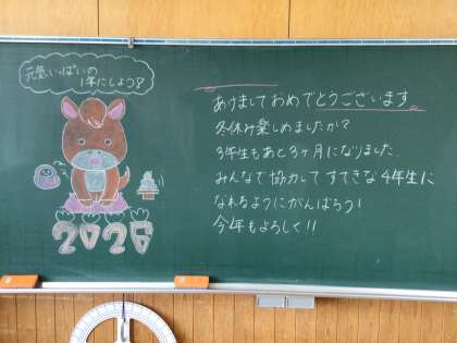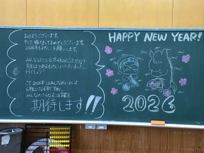令和8年がスタートしました。 担任の先生の思いの詰まった黒板が、子どもたちを出迎えました。
