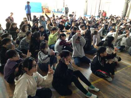 三択のクイズを全校児童で楽しく解きました。