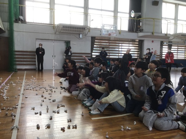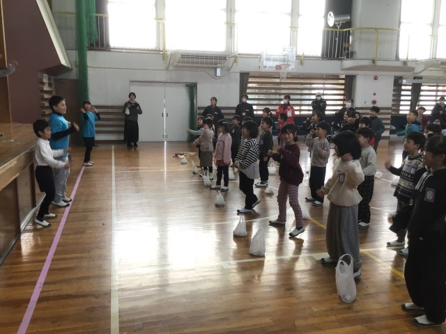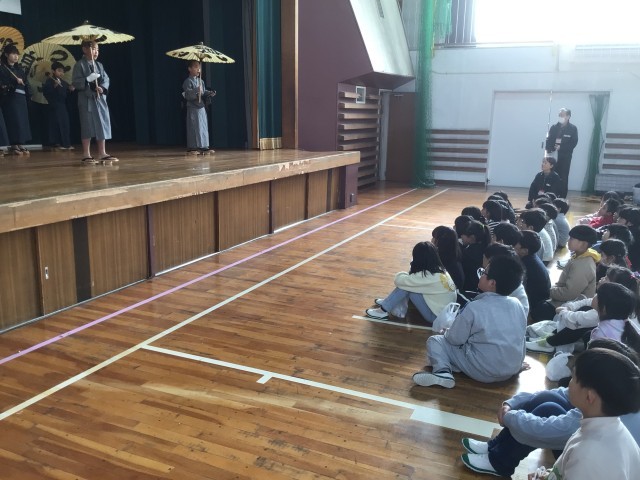 3年生が総合的な学習の時間に取り組んできた歌舞伎の発表会に、1年生を招待してくれました。1年生はおひねりを投げて応援しました。歌舞伎クイズや「おいでん」の踊りを踊るコーナーもありました。