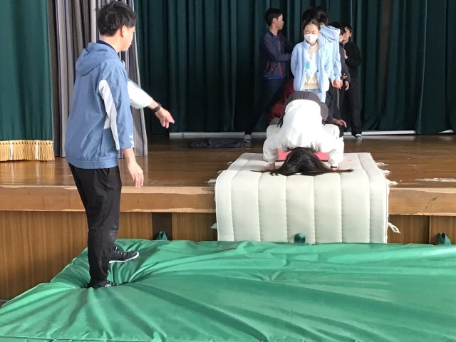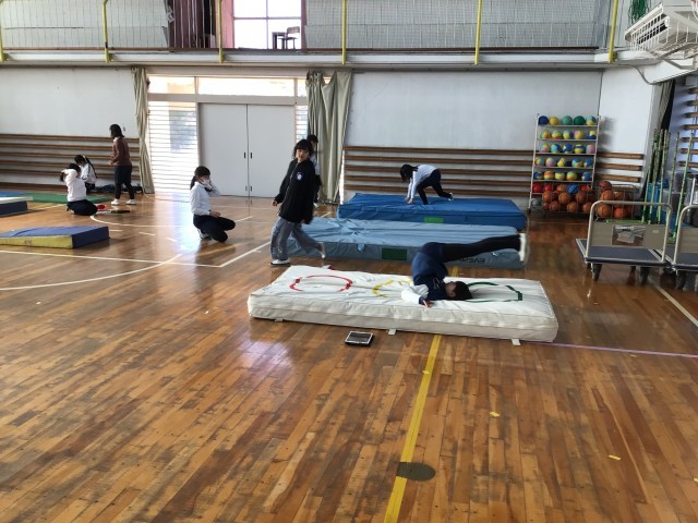 マット運動の様子です。できた技を友達とタブレットで撮影したり、練習したい技に合わせて練習場所を選択したりしています。