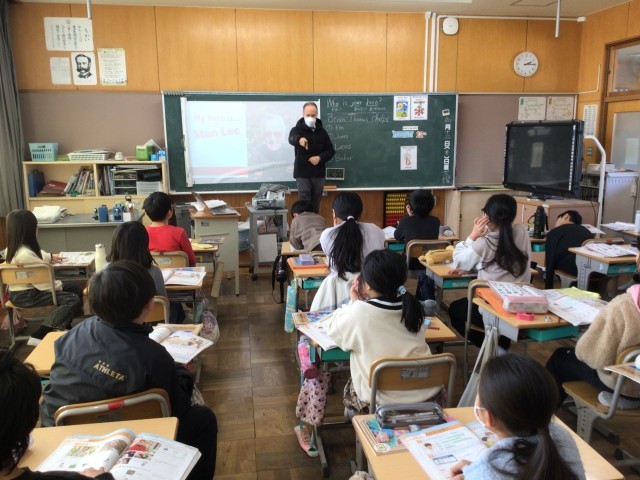 外国語では、自分の憧れの人「my hero」を紹介します。イメージをつかむために、ブライアン先生にお手本を見せてもらいました。