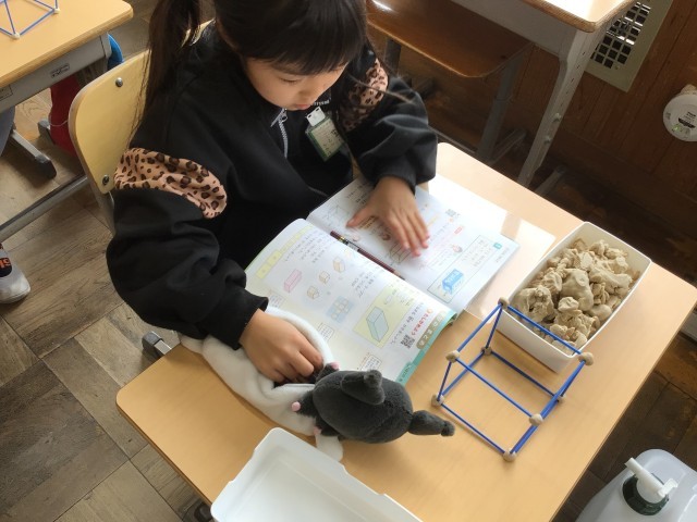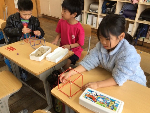 粘土玉とひごを使って箱を作りました。箱の頂点と辺の数に着目しながら箱の形について考えました。