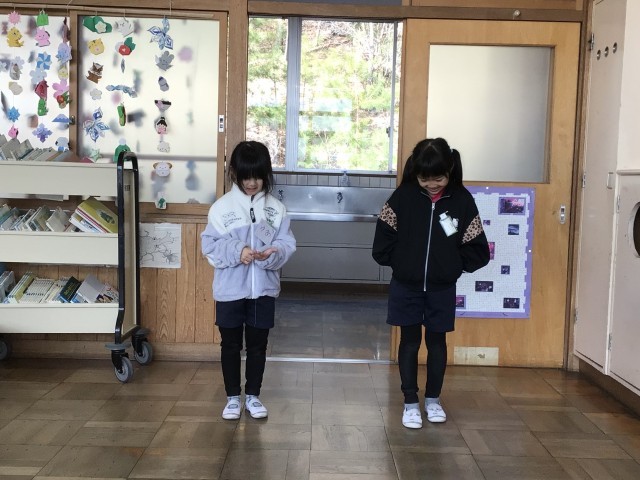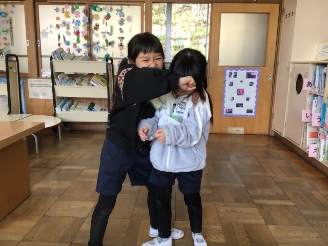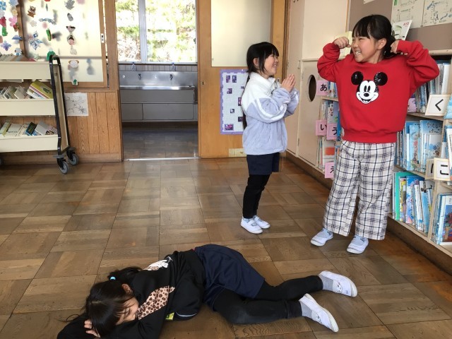 以前ホームページで紹介したジェスチャーゲームですが、最近は動きをつけて劇のような感じで出題してくれています。この4枚の写真で一つのお題になっています。なんでしょうか。
