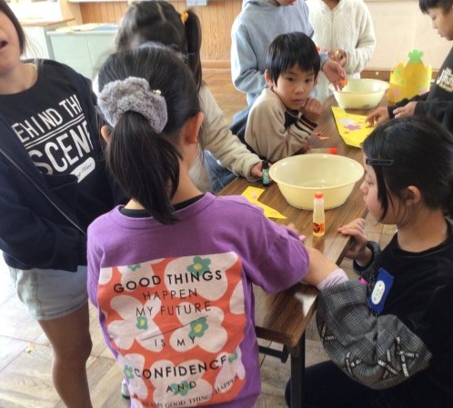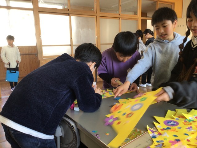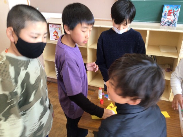 最後のF班です。目線を合わせて接する姿が印象的でした。集まりが終わった後、5年生で剥がれやすいところを貼り直していました。