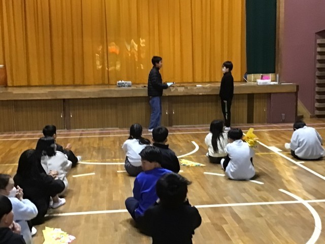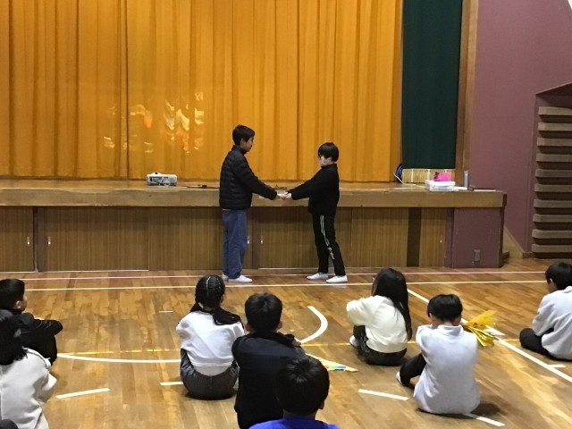 新たな挑戦をするために明日から半年間、飯野小を離れる子と別れのあいさつをしました。