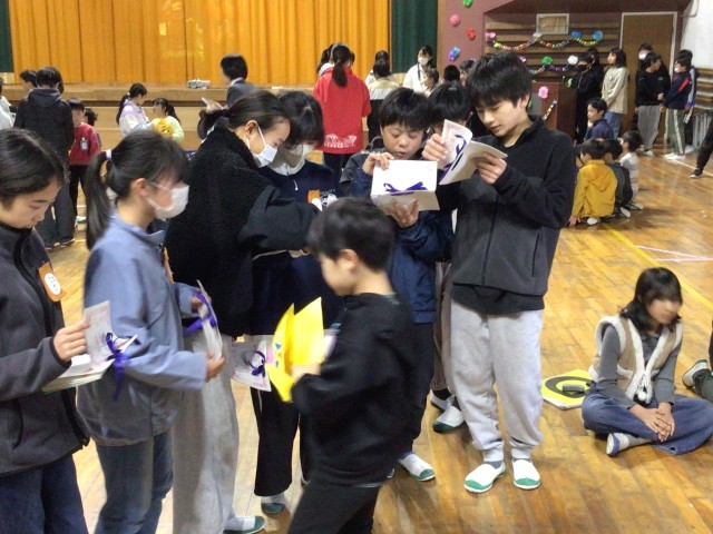 各学年が作ったプレゼントを6年生に贈りました。