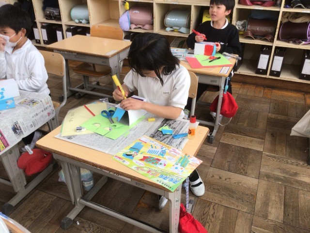 ロープを滑らせて走るおもちゃを作ります。何を走らせようかな?作ることが大好きな1年生。みんな楽しそうに想像しながら作っています。