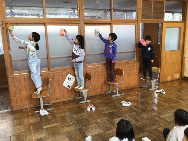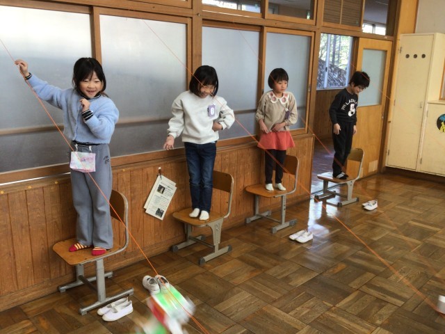 紐に引っ掛けてビューンと滑らせて遊びました。滑らせてみて、もっと良くなるように改良している子もいました。