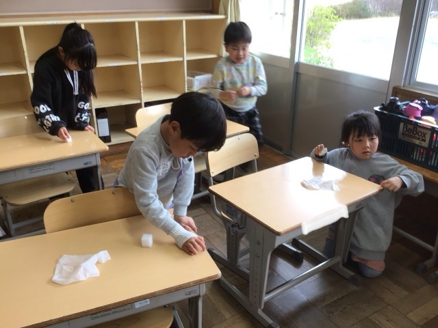 1年間使ってきた机と椅子、ロッカーの掃除をしました。次の1年生が気持ちよく使えるように、ピカピカにしました。