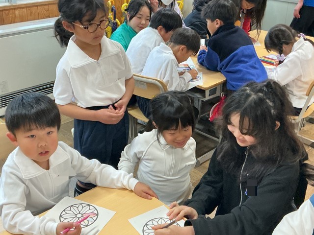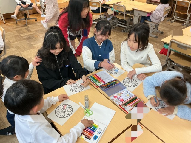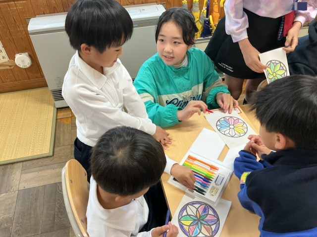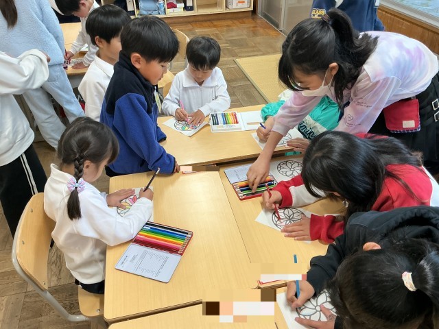 業間にぬりえを頑張っている1年生のところへ遊びに行きました。「好きな色何?」など1年生に聞いたり、自己紹介したりと交流する姿が見られました。