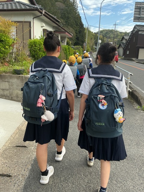 今朝は、藤岡中のお姉さんたちも、飯野っ子たちを見守って歩いていました。
