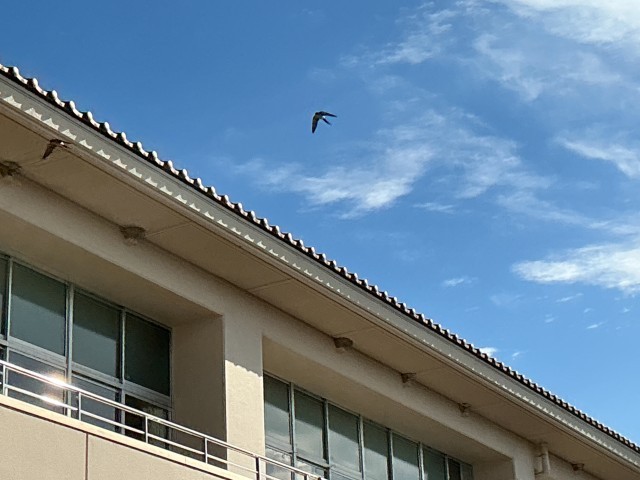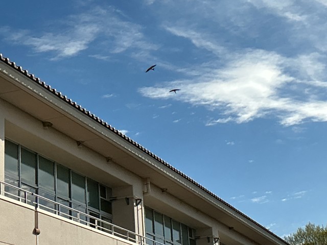 飯野小の校舎にも、ツバメたちがやって来て様子をうかがいながら、巣作りを始めています。