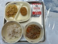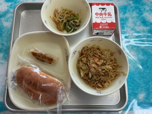今日の献立は、「米粉パン、牛乳、焼きそば、ぎょうざ、チンゲンサイの中華あえ」です。