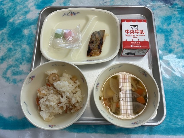 今日の給食は、「ちらしずし、牛乳、さわらの西京焼き、たけのこのすまし汁、花見だんご」の花見献立です。