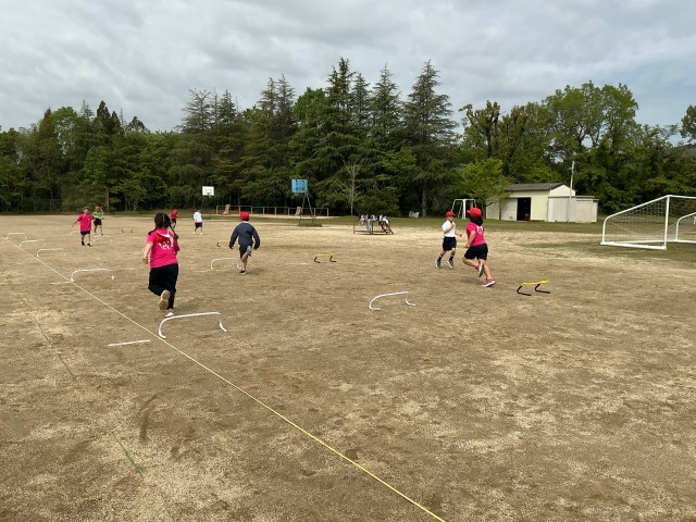 体育の授業でハードルを行っています。