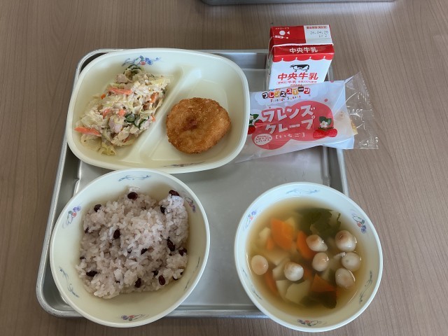 今日の給食献立は、「赤飯、牛乳、えびカツ、和風サラダ、ふだま汁、いちごクレープ」の入学と進級をお祝いする献立でした。