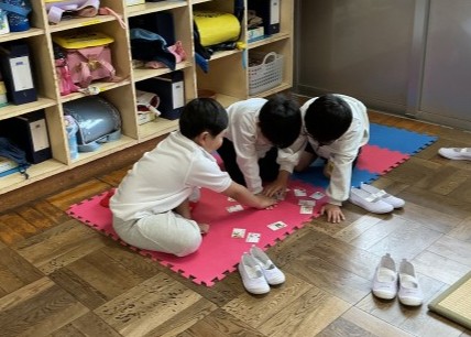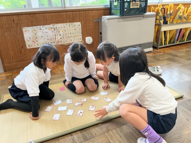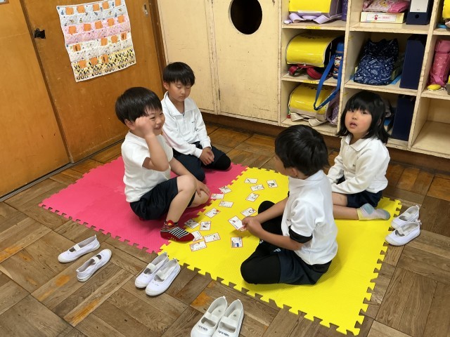 えんぴつは筆箱にしまうこと、ノートにはしたじきを敷くことなどかるたで遊びながら学びました。