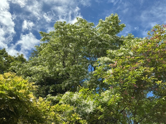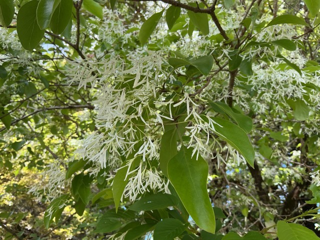 藤棚の少し奥にあるヒトツバタゴ(ナンジャモンジャ)が、新緑にふんわりとした雪が積もったかのように白く細長い花を咲かせています。