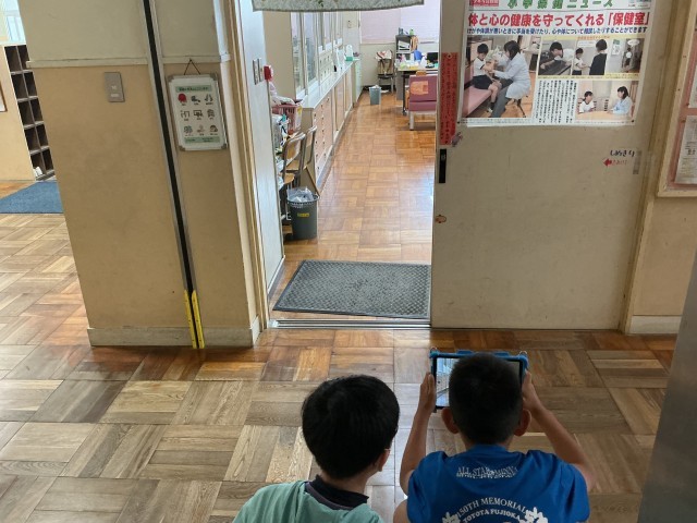 それぞれのグループの仕掛けが設置完了し、タブレットで互いの作品を写真におさめました。お互いの作品を見て、「お~」と感動していました。