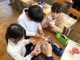 学校や鞍ヶ池公園で集めた秋のはっぱをラミネートし,飾りにしました。はじめは紙紐を...