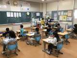 書写の時間です。今日の文字は「水玉」です。どの子もとても集中して練習していました...