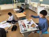 図画工作科の時間です。「ふしぎなたまご」の絵に色をぬっていました。たまごのデザイ...
