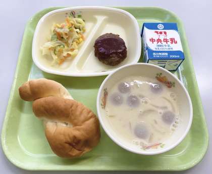 【ツイストパン、牛乳、ハンバーグ、かんきつサラダ、豆乳スープ】でした。