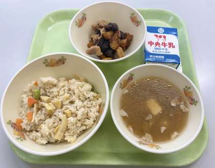 【たけのこごはん、牛乳、レバーとじゃがいもの甘辛煮、あおさ汁】でした。