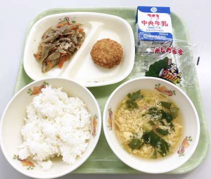 【ごはん、牛乳、メンチカツ、きんぴらごぼう、かき玉汁、柏餅】です。