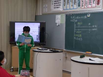 今日の5年生の算数は、小数のかけ算です。「Aの〇倍はBです。Aが□の時、Bはいくつになる?」といった内容でしたが、子どもたちはよく考え、各自の考え方を述べていました。