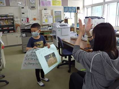 この日は1年生の児童が職員室に訪れ、自分で作ったクイズを出していました。