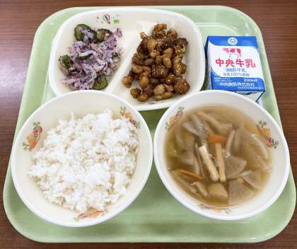 【ごはん、牛乳、まぐろと大豆のみそがらめ、ゆかりあえ、かしわ汁】でした。