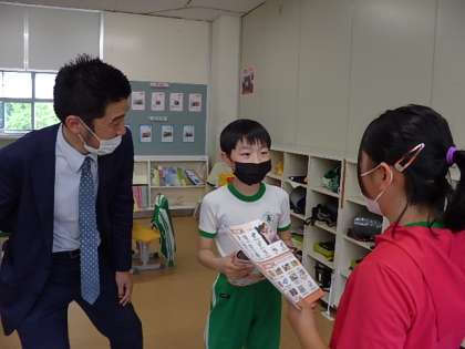 ジェイソン先生も交え、様々な英語の表現を他者とのやり取りの中で使っていきます。カードを利用して気持ちを伝える場面では、覚えた表現を盛んに使っていました。