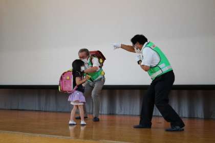 最初はクイズです。不審者に関するものでしたが、人は見かけによらないので外見で判断はできない。「じっと見てくる」「理由なく近づいてくる」「付きまとう」などの行動に注意することを教えていただきました。