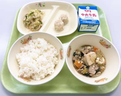【ごはん、牛乳、えびしゅうまい、バンサンスー、豆腐の中華煮】でした。