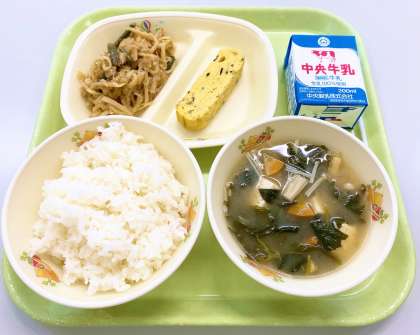 【ごはん、牛乳、ひじき入り卵焼き、切干し大根の炒め煮、モロヘイヤのみそ汁】でした。