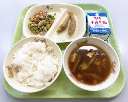 【ごはん、牛乳、めひかりフライ、大豆のピリ辛炒め、豊田のみそ汁】でした。