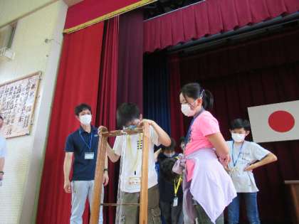 一緒に昼食を食べた後、透視度計を使っての水質汚濁調査を体験しました。透視度計に入れた水を抜いていくと、底にある印が見えてきます。その瞬間を見逃すまいと、子どもたちはじっとのぞきこんでいました。