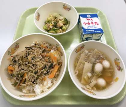 9月3日(金)の給食は、 【ビビンバ丼、牛乳、中華風サラダ、ワンタンスープ】でした。