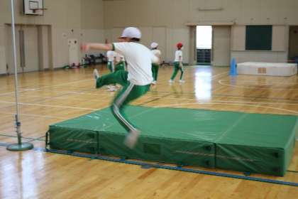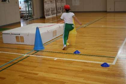 きれいなフォームで跳ぶ子や助走の歩幅を工夫する子が見られます。