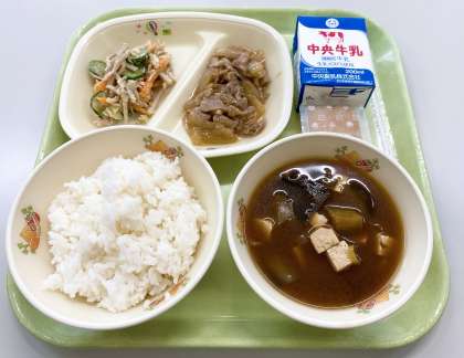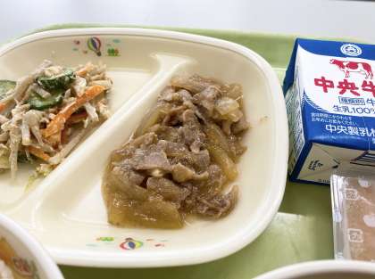 【ごはん、牛乳、ひまわりポークのしょうが炒め、ごぼうサラダ、なすのみそ汁、ももゼリー】でした。