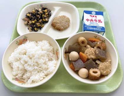 9月24日(金)の給食は、 【ごはん、牛乳、キャベツ入りつくね、鉄人サラダ、関東煮】でした。
