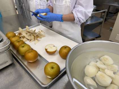 果物の梨は、豊田市産の「あきづき」という品種の梨を使用しています。とても甘くみずみずしいのが特徴です。給食では、調理員さんが一つ一つ皮をむいて、ていねいに調理してくれました。地元の食材を食べられることや、調理してくれる方がいることへの感謝の気持ちを忘れずに味わって食べてほしいと思います。