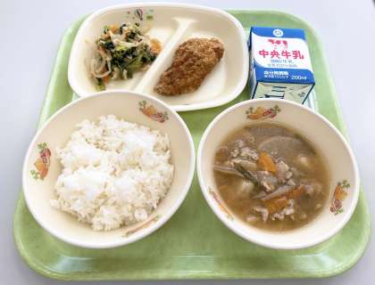 【ごはん、牛乳、カレイフライ、野菜のごまあえ、豚汁】でした。