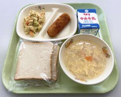 【スライスパン、牛乳、いかフライのレモンしょうゆがけ、野菜カレーサンドの具、たまごスープ】でした。