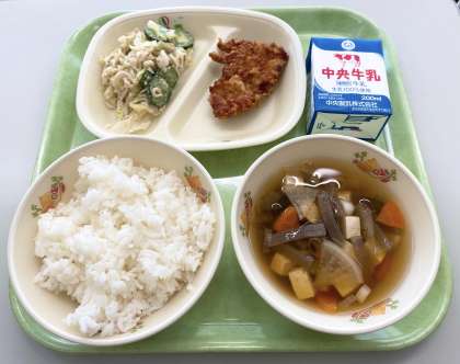 【ごはん、牛乳、とり天、切干大根のごまマヨあえ、けんちん汁】でした。